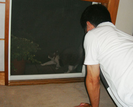 夜になって涼しくなると、やっとブラシかけてニャンコール。