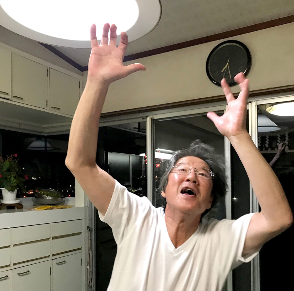 私に似ているような似ていないような?…、年の取り方に共通点を感じる、弟です。花火を邪魔して写真撮影には非協力的。