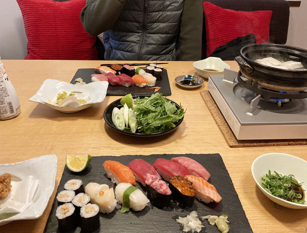 私が食材を冷蔵庫にしまったり湯豆腐などの準備をする間、ニカさんにお寿司を盛り付けてもらい、帰宅後15分で宴会の準備完了!