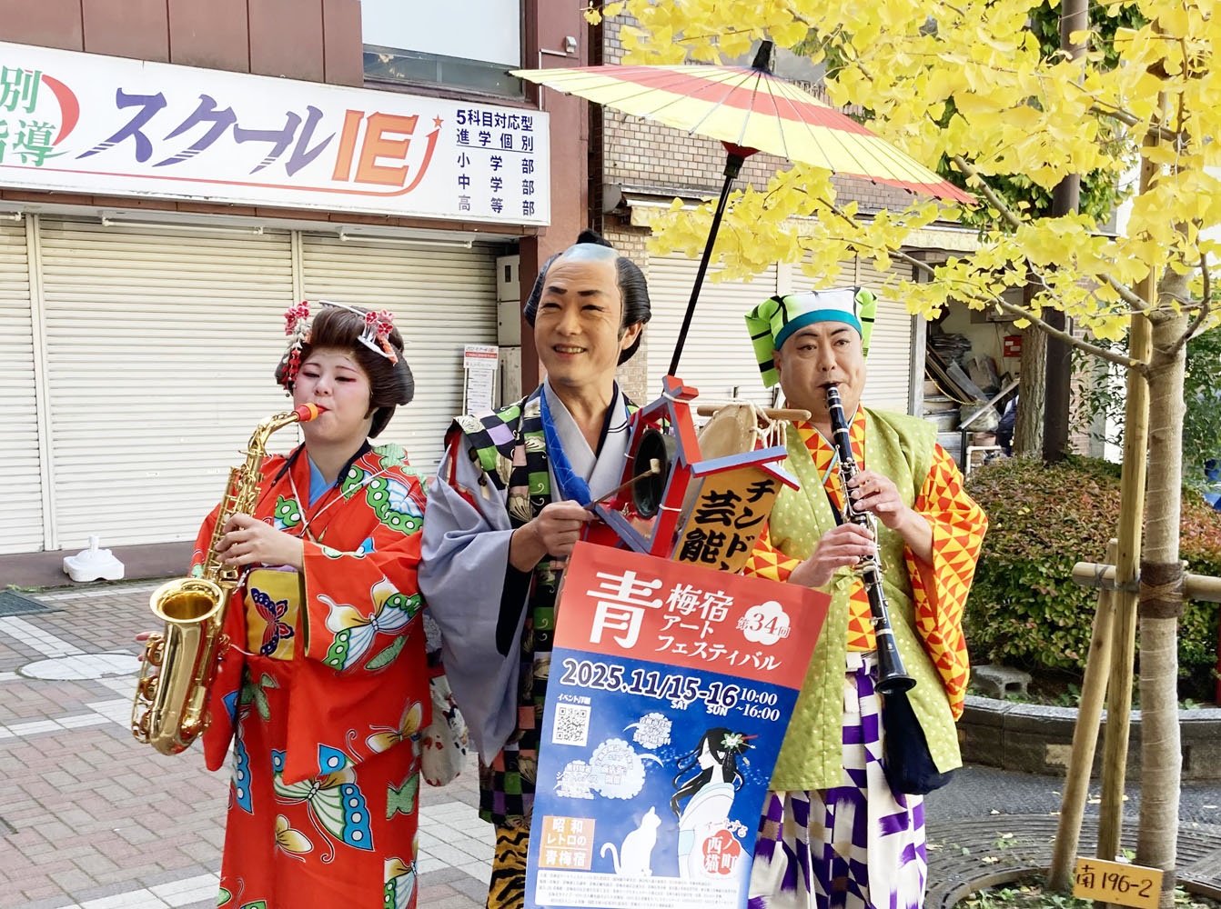 バスで到着した青梅駅前では、ちんどん屋さんが笑顔で景気良くお出迎え!