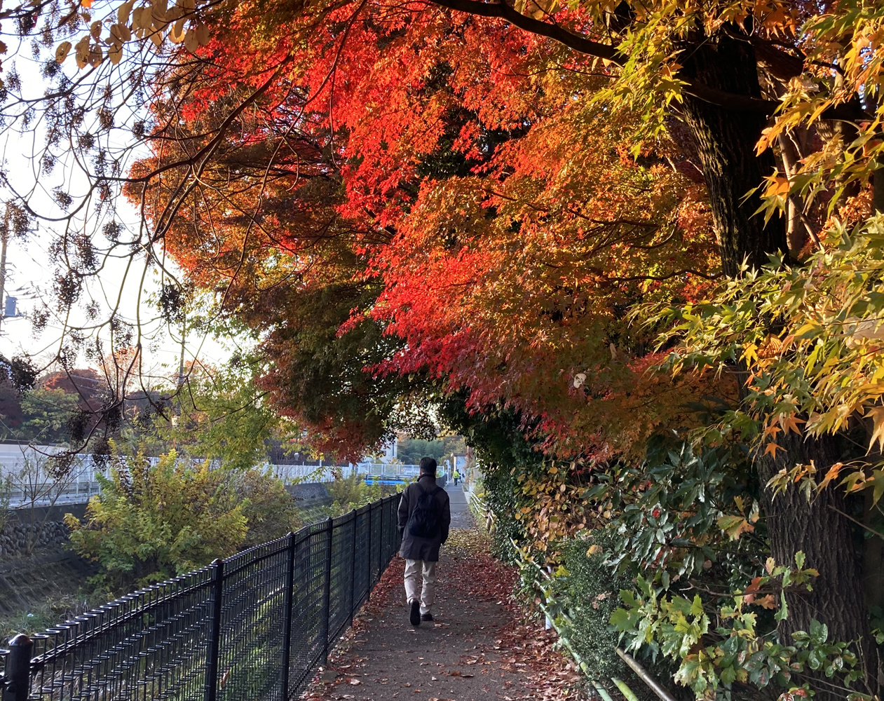 青梅駅に朝8時集合なので7時過ぎに家を出ると、家の近くの遊歩道では紅葉が見頃でした。