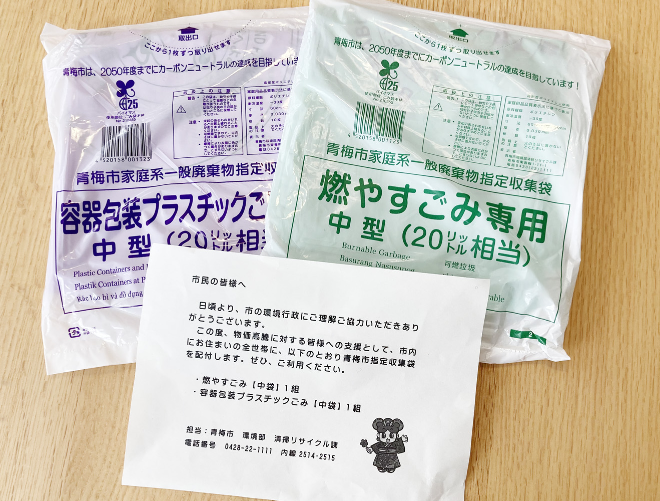 青梅市から「物価高騰支援!」として全家庭に届いたのは..、市指定のごみ収集袋。