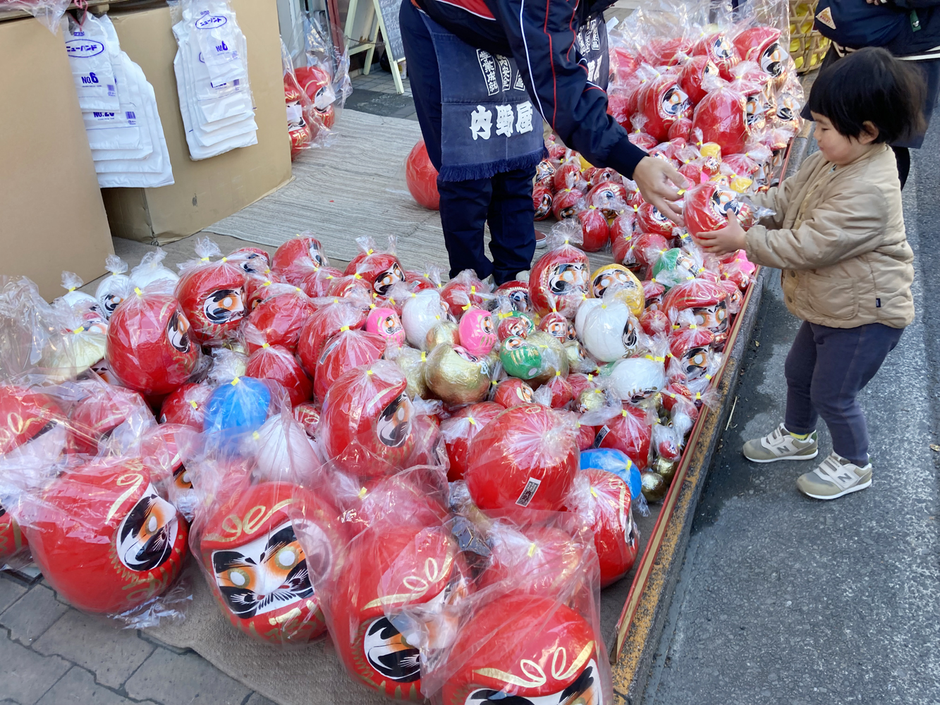 露店のところどころに現れるダルマ店には、赤を基本に色とリどりのダルマや変わりダルマが盛られていました。
