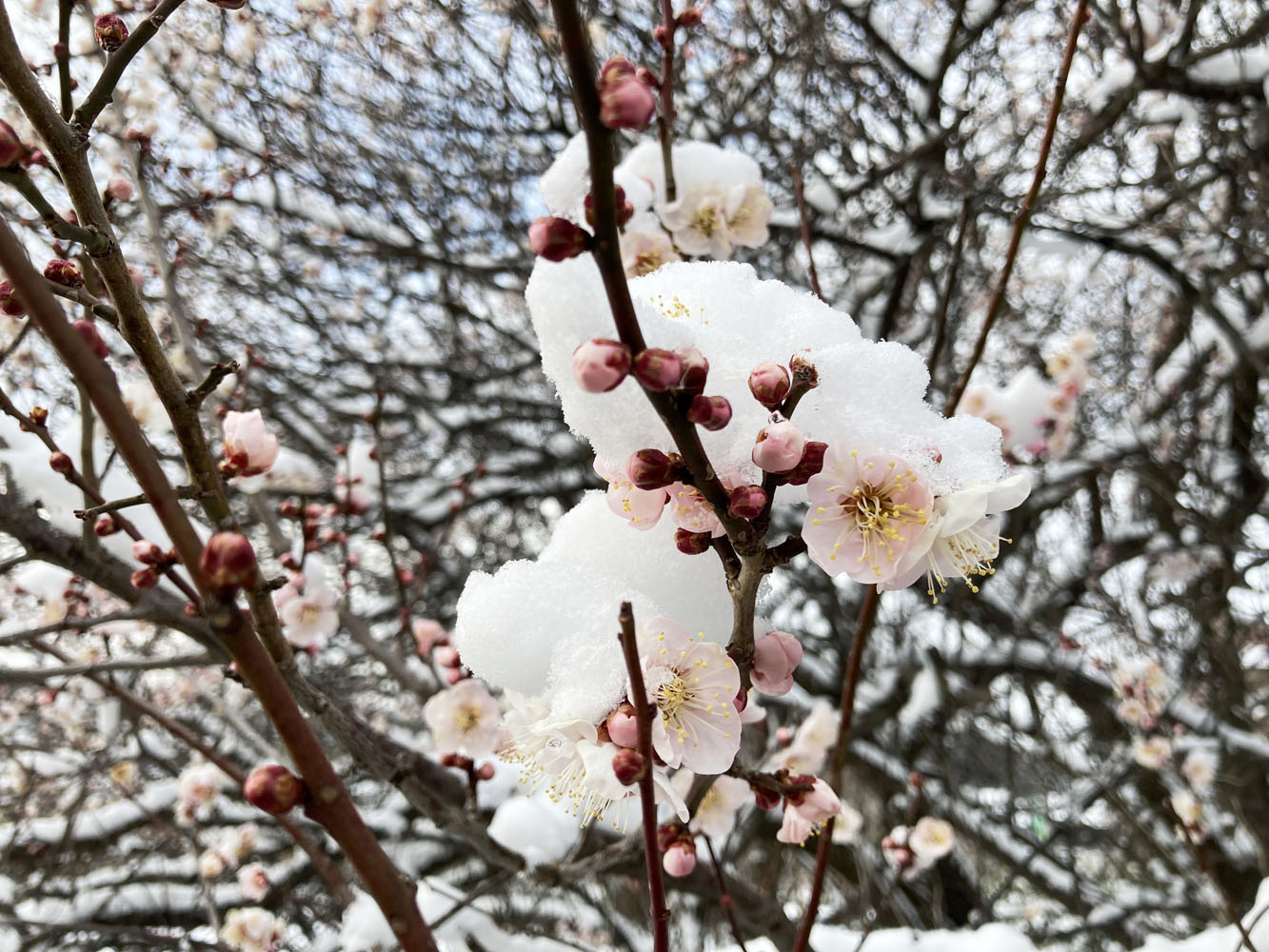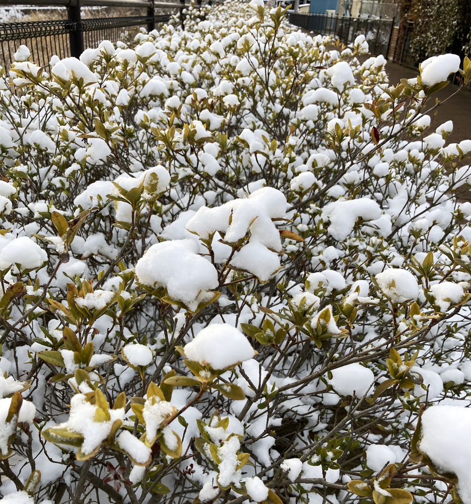 雪景色の中を歩けば、せっかく開いた梅の花には雪が積もり、まだ咲かないツツジには雪の花が咲いていました。